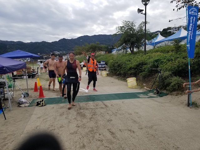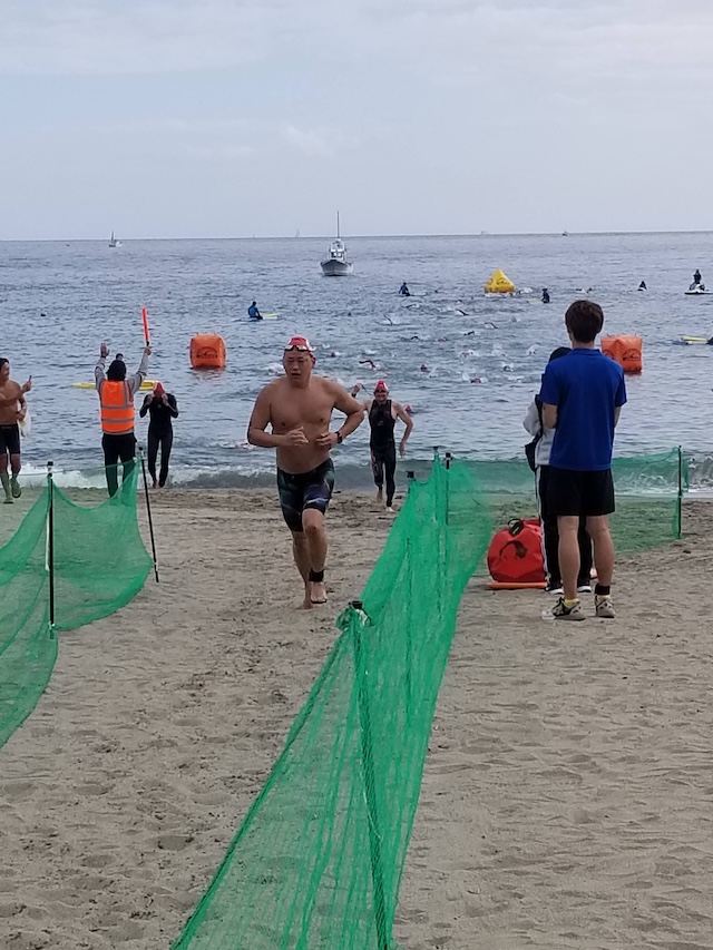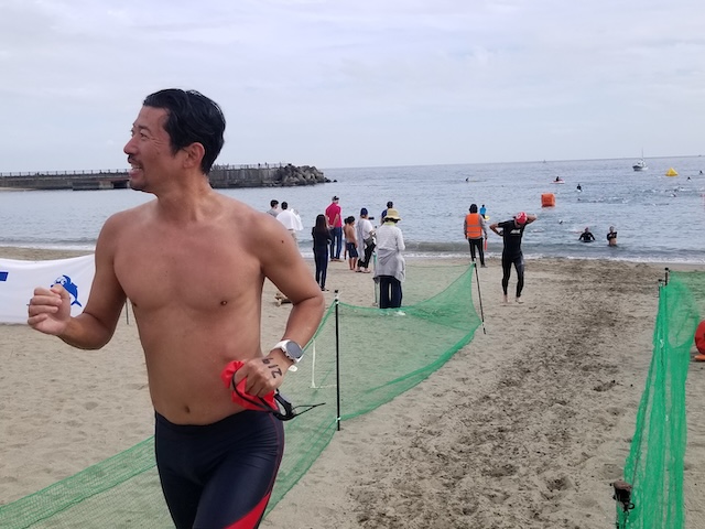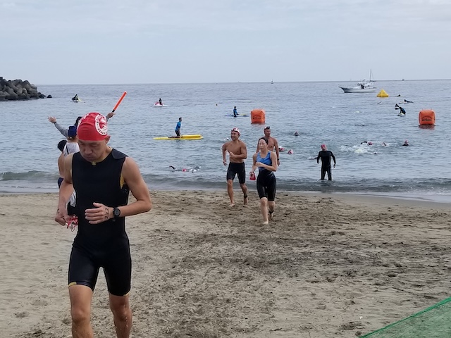 レースが予定通りショートの部から10:00にスイムがスタートし85名の選手が海に飛び込んでいった。やはり最終戦だけあって全体的にスイムは安定して泳いでいたようだ。そしてランもトランジションエリアでウエアとシューズを身に着けてスタートし公園内をいっぱいにつかったランニングコースは途中地元の方々が出店するイベント広場となる芝生エリアを横切りながら走る姿は“いい感じ“そのもの。そして両側突堤では釣り客が自身の竿を休めて応援していたのが印象的であった。