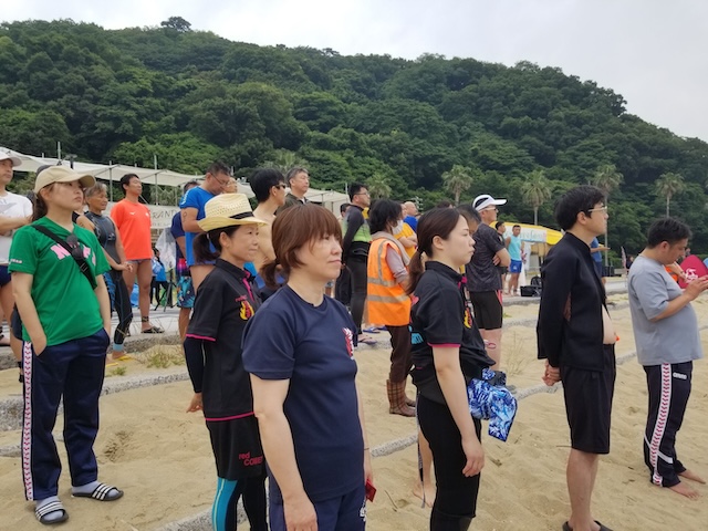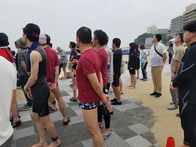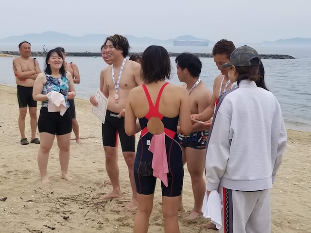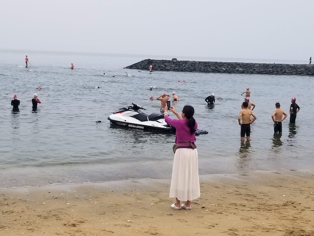特に、1500メートルと3000メートルの種目では、遥かかなたに小さく見える海上ブイを目指し最短距離をご自分で選んで進むのが難しかった、クラゲがいて刺されたと初心者ならではの感想も聞こえた。