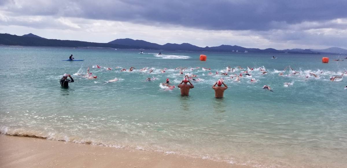 秋の沖縄の風と海の状態を考慮し選択した名護の海は、透明度が高く、めだかのような小魚の大群の中を泳ぐ素晴らしさと、3000mの競技では、沖合いに急に発生したうねりで過酷なレースへと変化した。