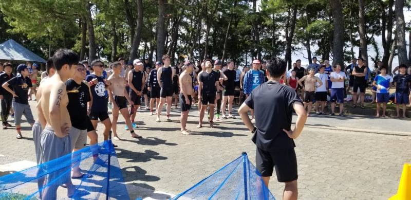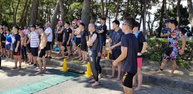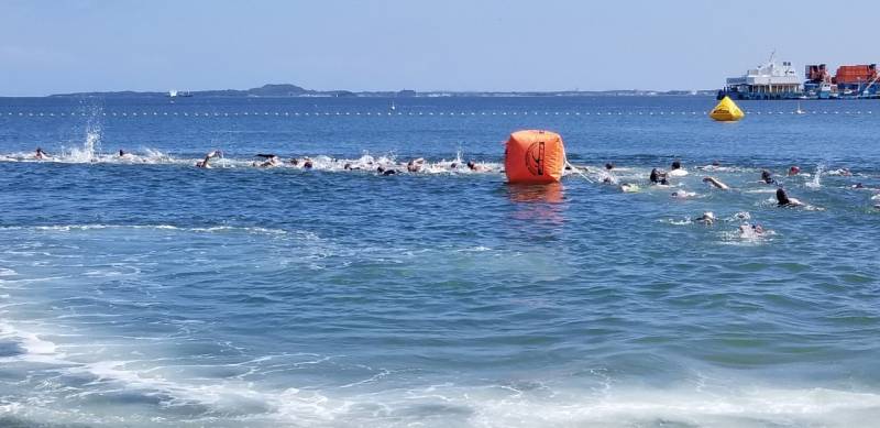 参加者約150名、ショートの部のスタート時外気温32℃、海水温26℃とウエットスーツで泳ぐと熱中症を招きやすくなると忠告した。