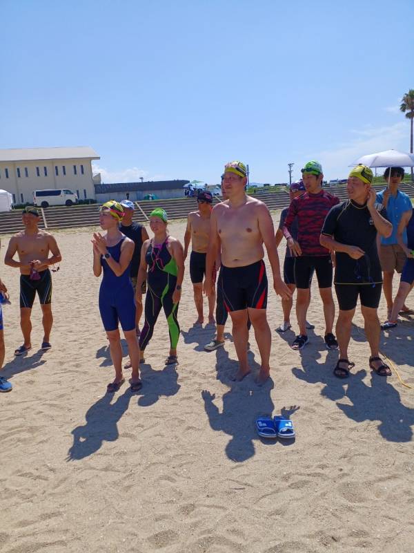 早く海に入りたいと焼けつく砂浜で待機する選手