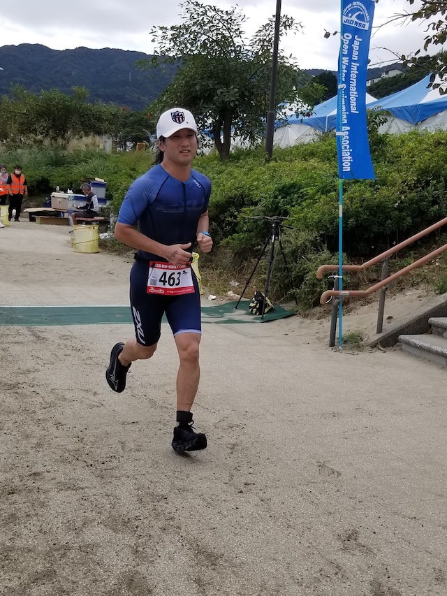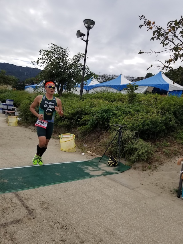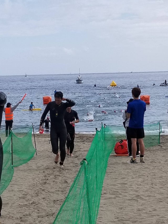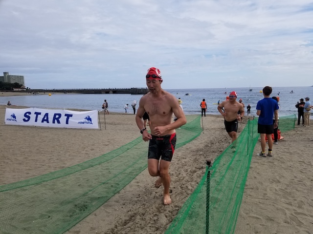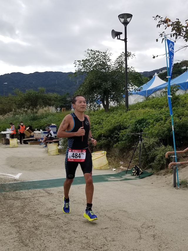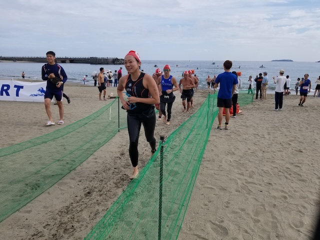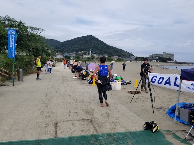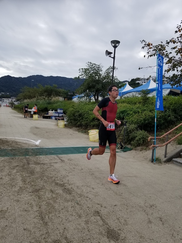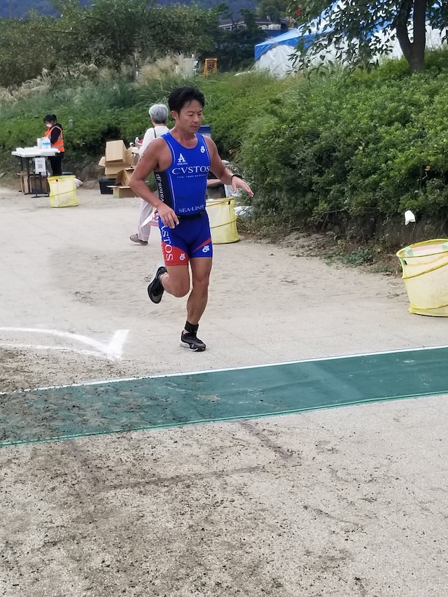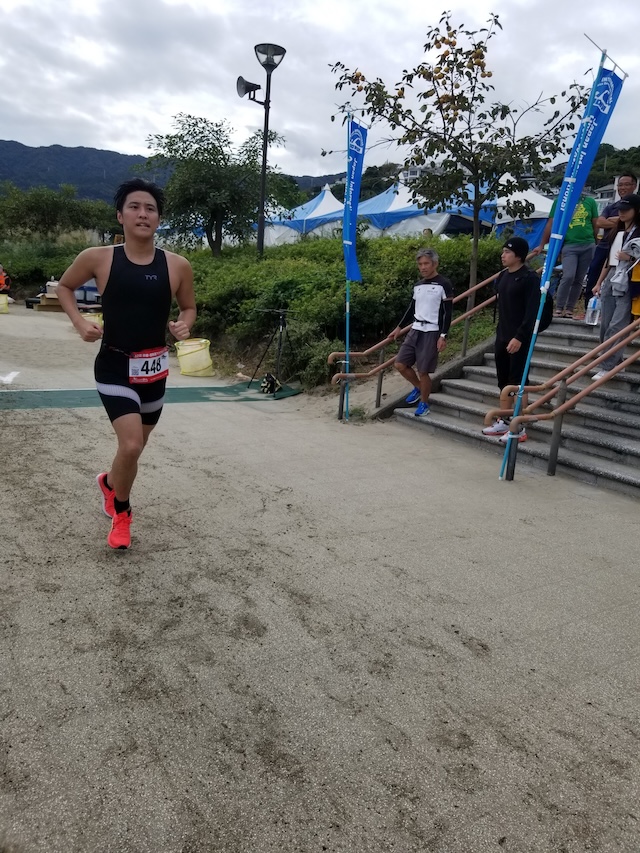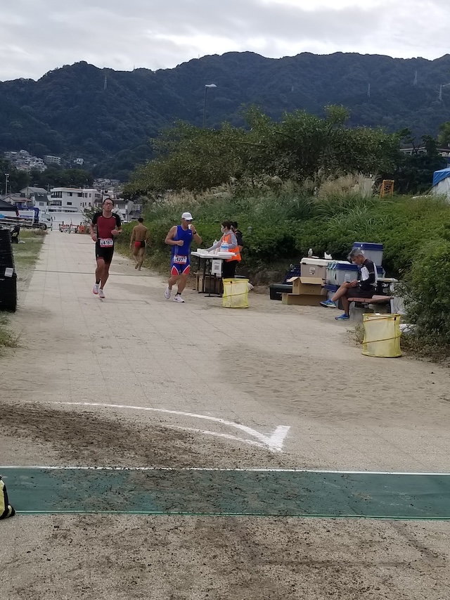 レースが予定通りショートの部から10:00にスイムがスタートし85名の選手が海に飛び込んでいった。やはり最終戦だけあって全体的にスイムは安定して泳いでいたようだ。そしてランもトランジションエリアでウエアとシューズを身に着けてスタートし公園内をいっぱいにつかったランニングコースは途中地元の方々が出店するイベント広場となる芝生エリアを横切りながら走る姿は“いい感じ“そのもの。そして両側突堤では釣り客が自身の竿を休めて応援していたのが印象的であった。