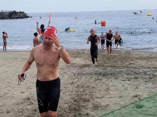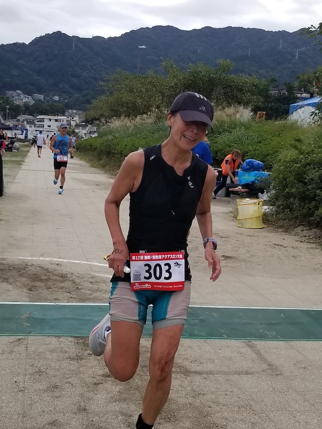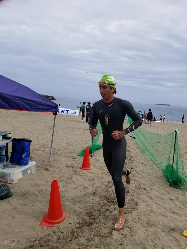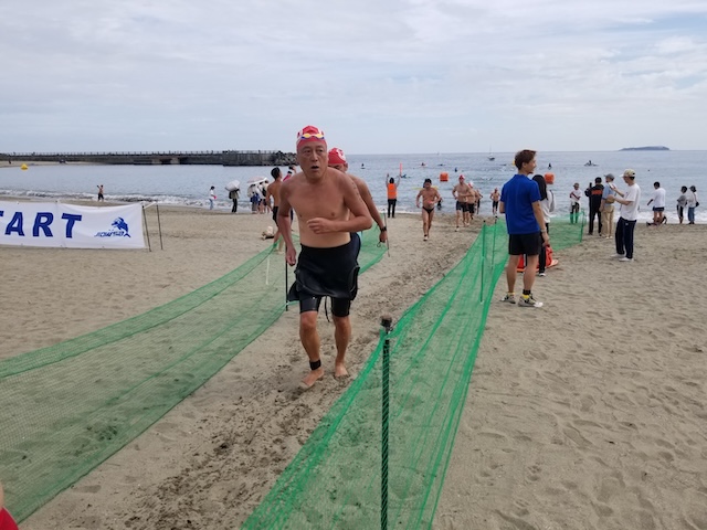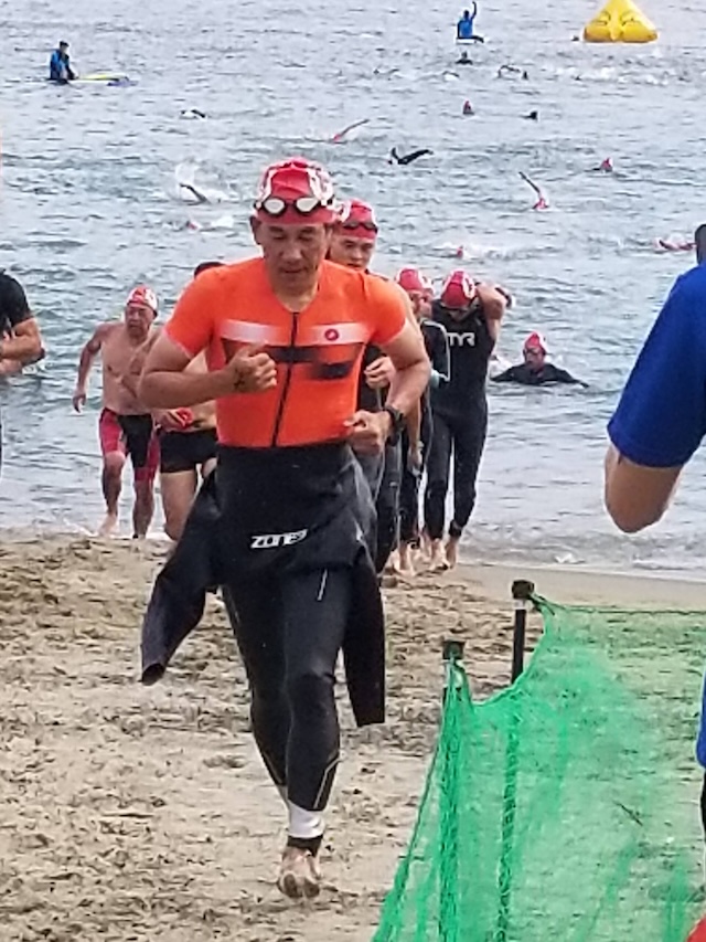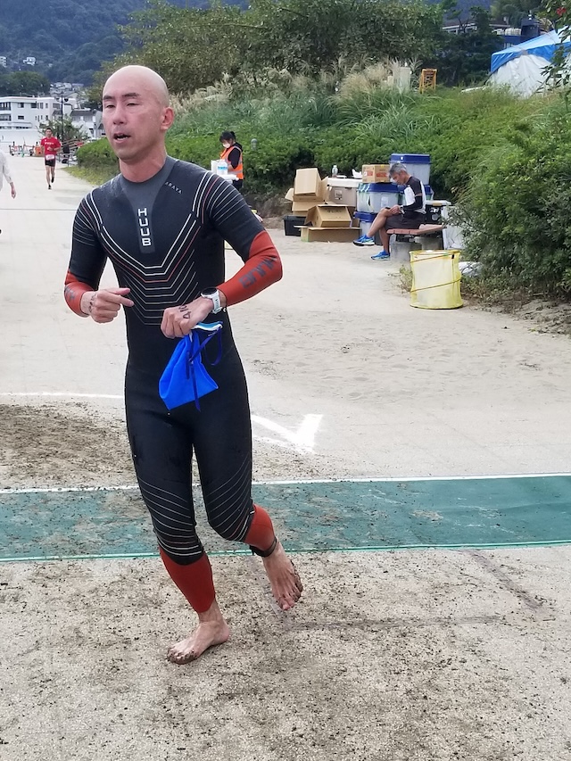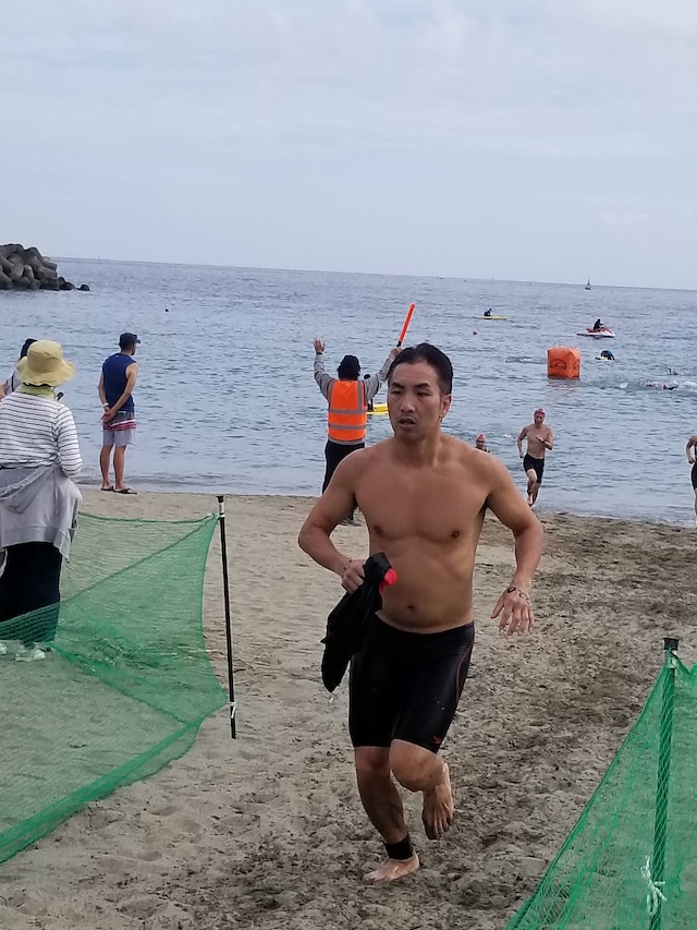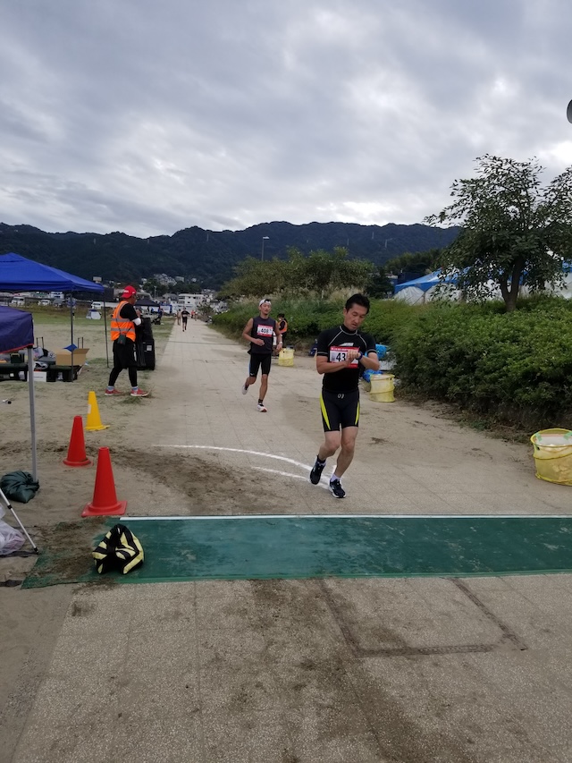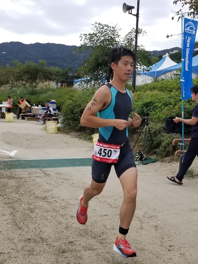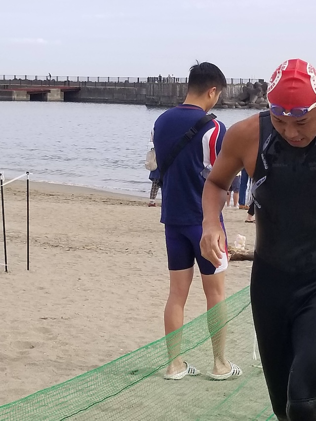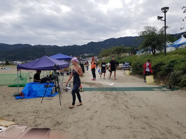 レースが予定通りショートの部から10:00にスイムがスタートし85名の選手が海に飛び込んでいった。やはり最終戦だけあって全体的にスイムは安定して泳いでいたようだ。そしてランもトランジションエリアでウエアとシューズを身に着けてスタートし公園内をいっぱいにつかったランニングコースは途中地元の方々が出店するイベント広場となる芝生エリアを横切りながら走る姿は“いい感じ“そのもの。そして両側突堤では釣り客が自身の竿を休めて応援していたのが印象的であった。
