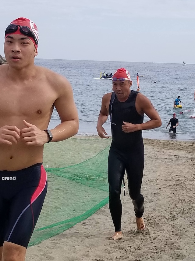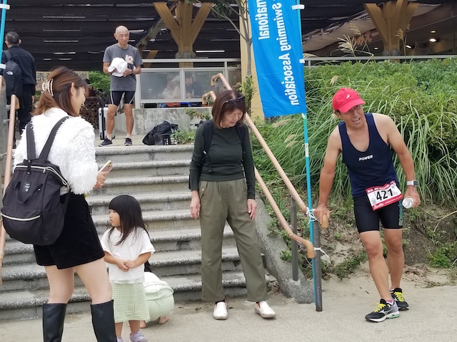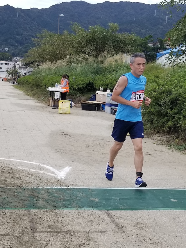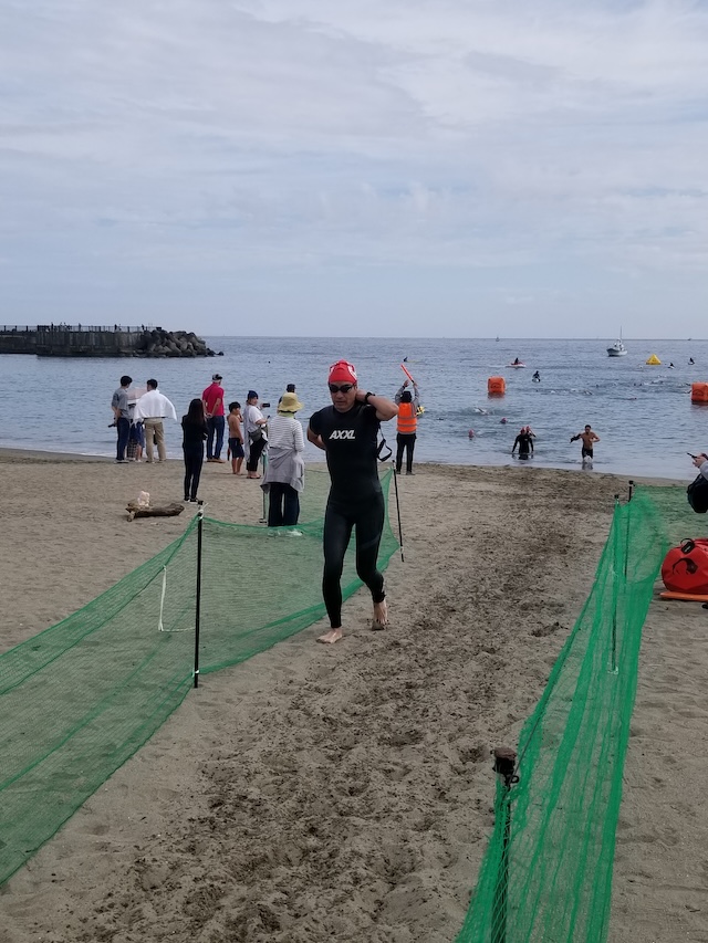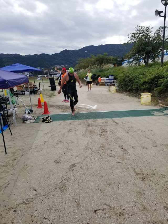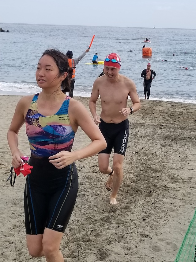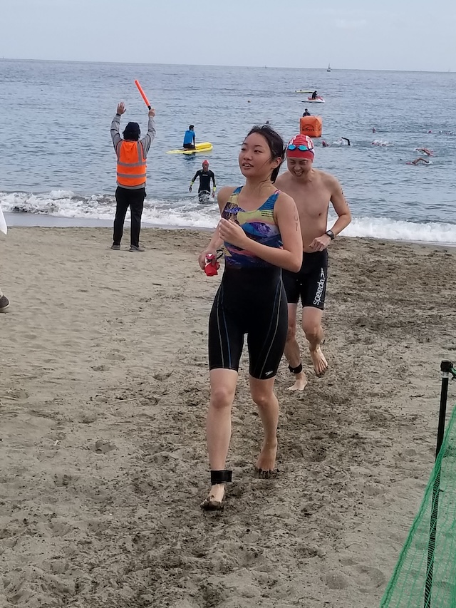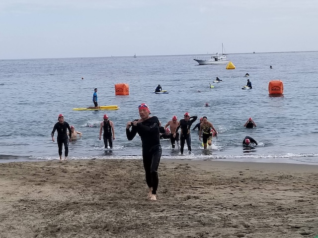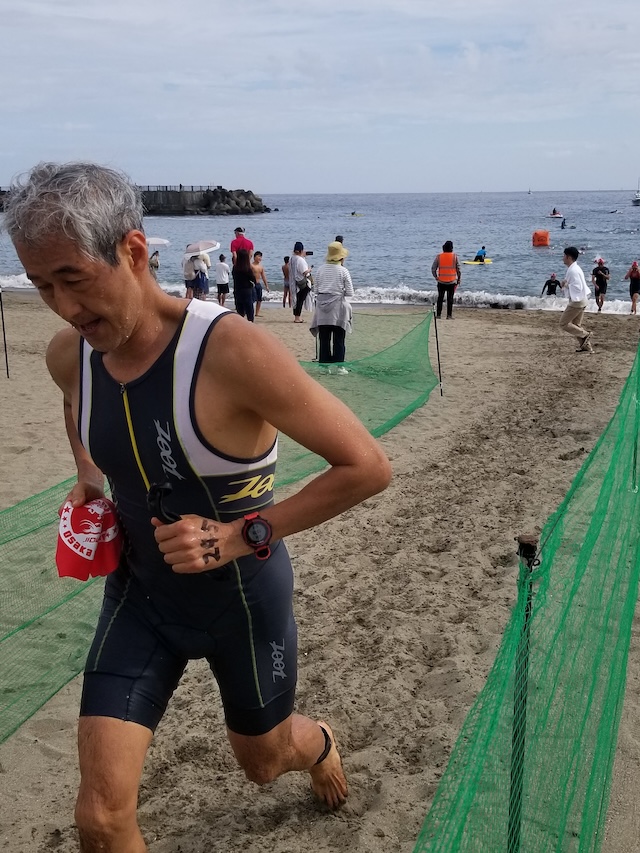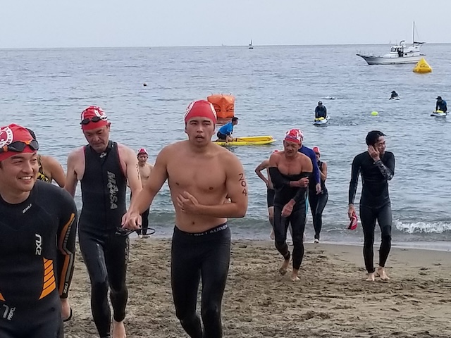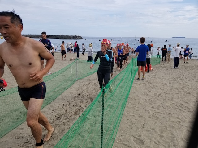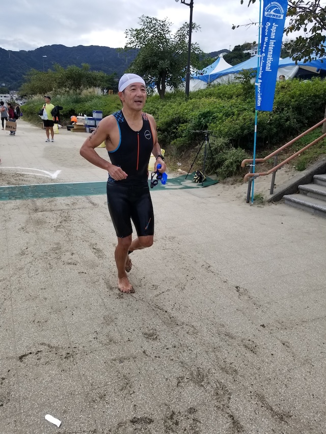 レースが予定通りショートの部から10:00にスイムがスタートし85名の選手が海に飛び込んでいった。やはり最終戦だけあって全体的にスイムは安定して泳いでいたようだ。そしてランもトランジションエリアでウエアとシューズを身に着けてスタートし公園内をいっぱいにつかったランニングコースは途中地元の方々が出店するイベント広場となる芝生エリアを横切りながら走る姿は“いい感じ“そのもの。そして両側突堤では釣り客が自身の竿を休めて応援していたのが印象的であった。