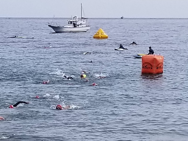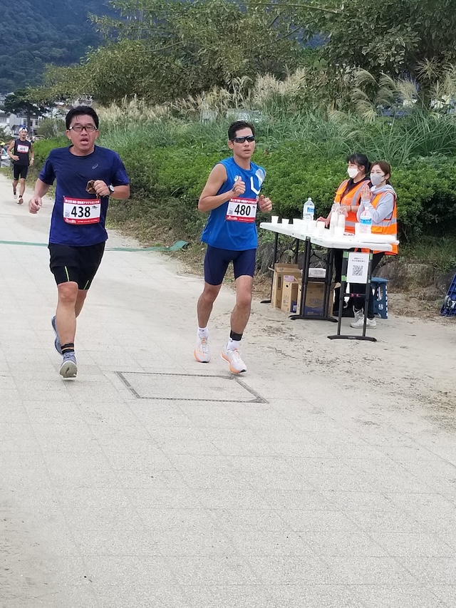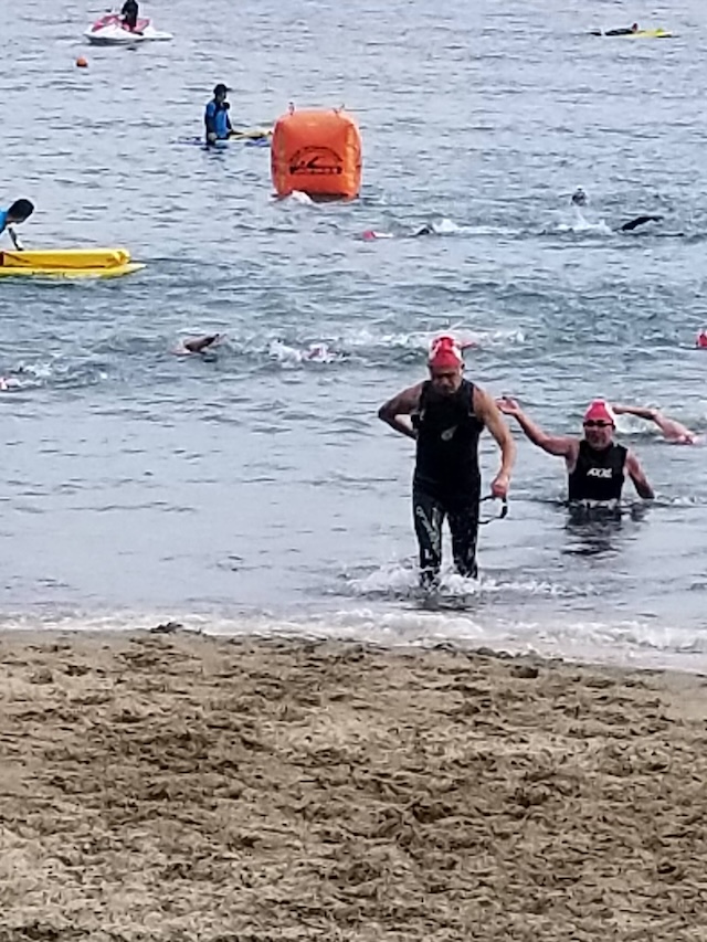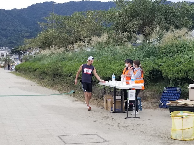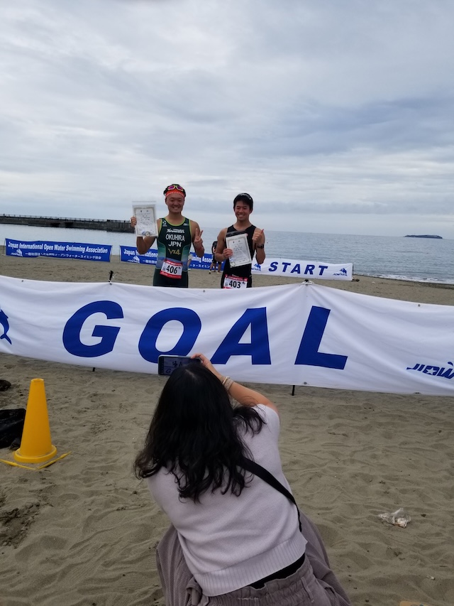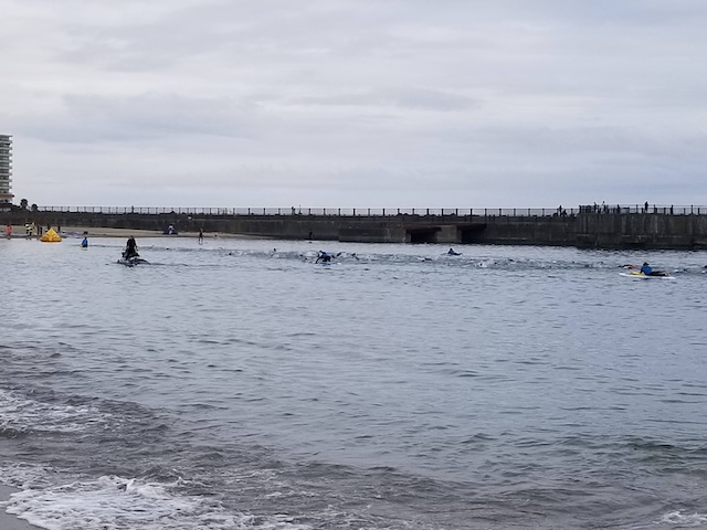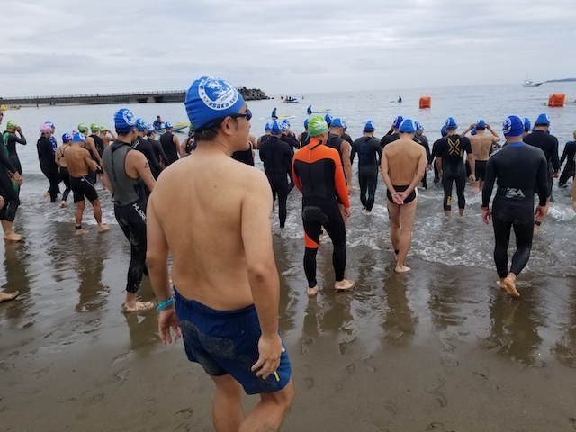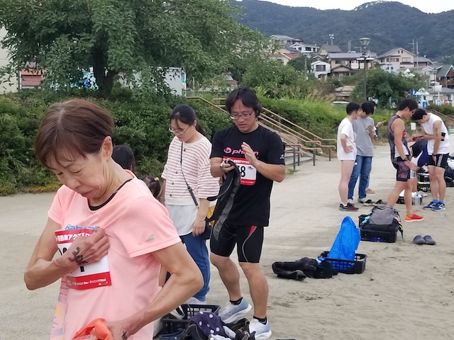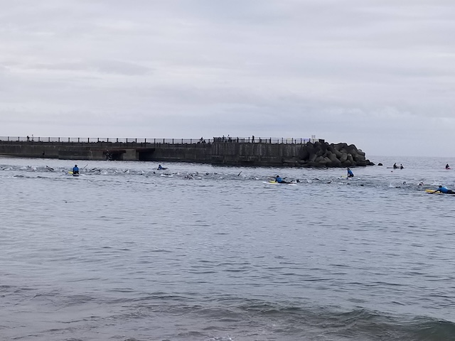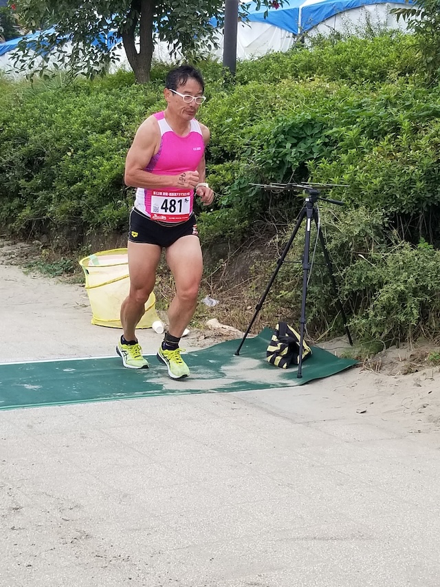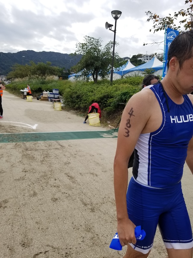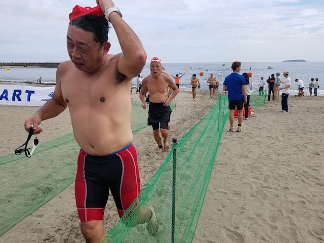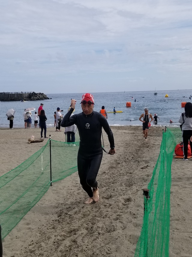 レースが予定通りショートの部から10:00にスイムがスタートし85名の選手が海に飛び込んでいった。やはり最終戦だけあって全体的にスイムは安定して泳いでいたようだ。そしてランもトランジションエリアでウエアとシューズを身に着けてスタートし公園内をいっぱいにつかったランニングコースは途中地元の方々が出店するイベント広場となる芝生エリアを横切りながら走る姿は“いい感じ“そのもの。そして両側突堤では釣り客が自身の竿を休めて応援していたのが印象的であった。