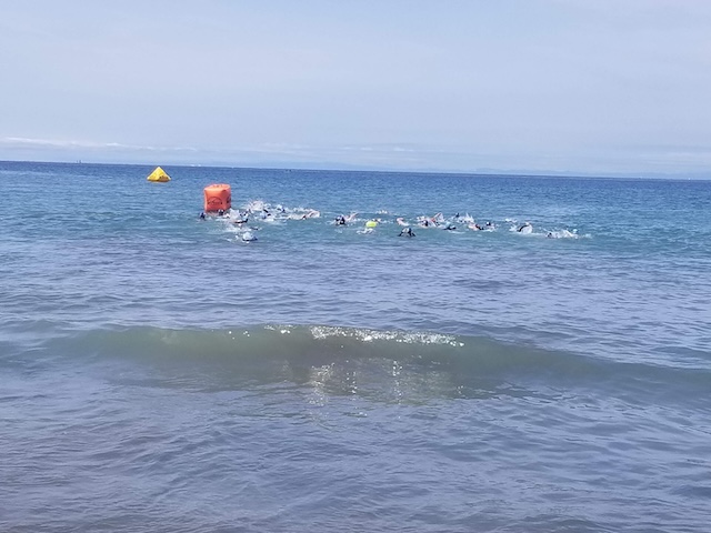 風もうねりもおさまり穏やかな海が確認されたので、ショート、ロング、スイム、リレーの全部門が、なるべくウェットスーツを利用するよう推奨されてスタートとなった。
