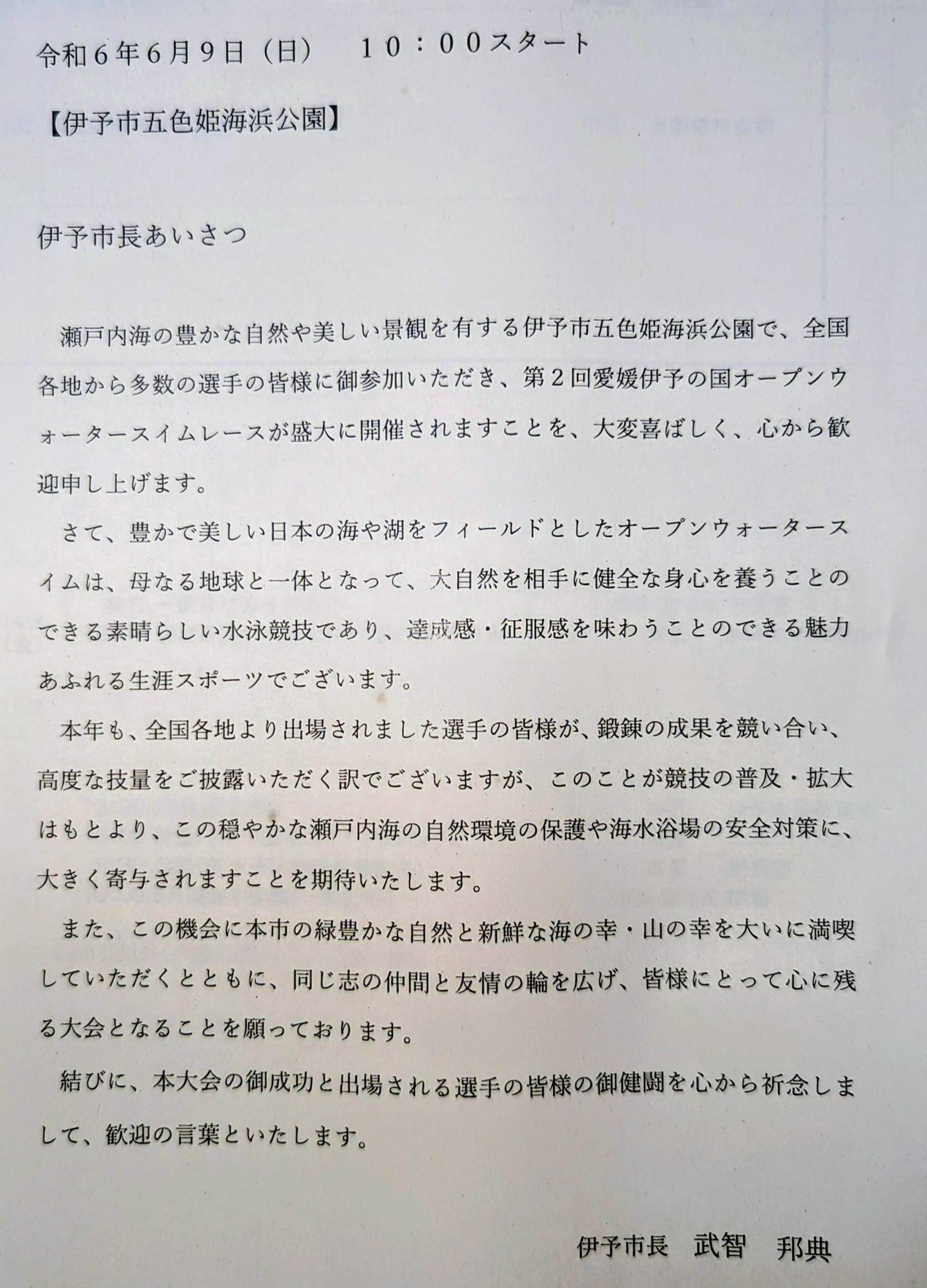伊予市のサポート、武智市長のJIOWSA Tシャツでのスターター役などに深く敬意を表します。