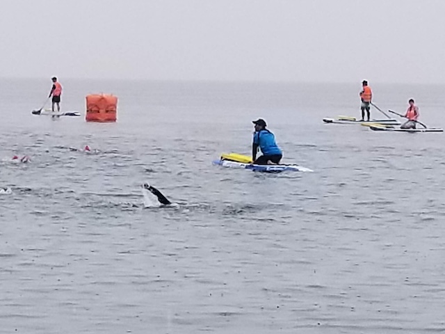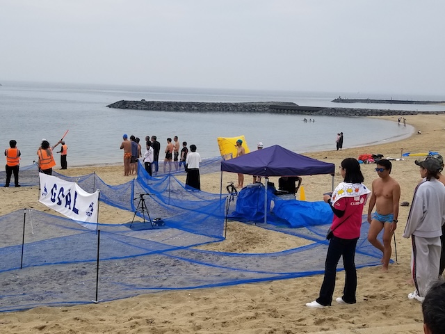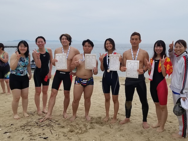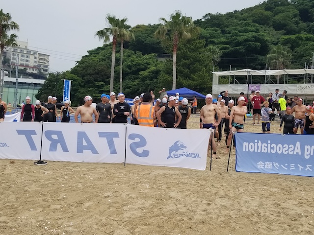 特に、1500メートルと3000メートルの種目では、遥かかなたに小さく見える海上ブイを目指し最短距離をご自分で選んで進むのが難しかった、クラゲがいて刺されたと初心者ならではの感想も聞こえた。