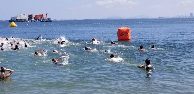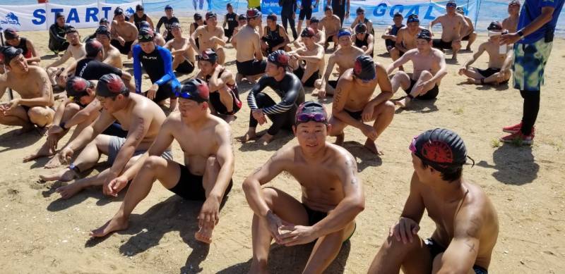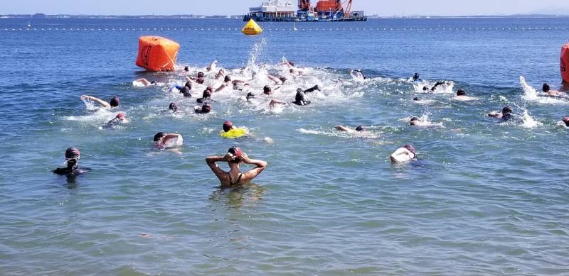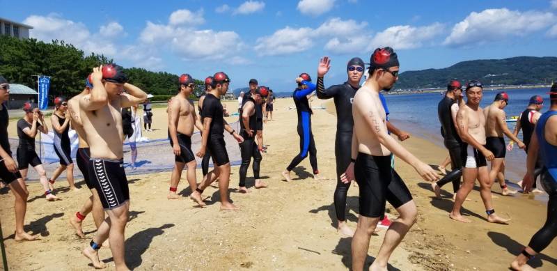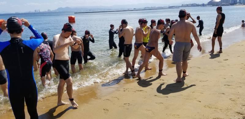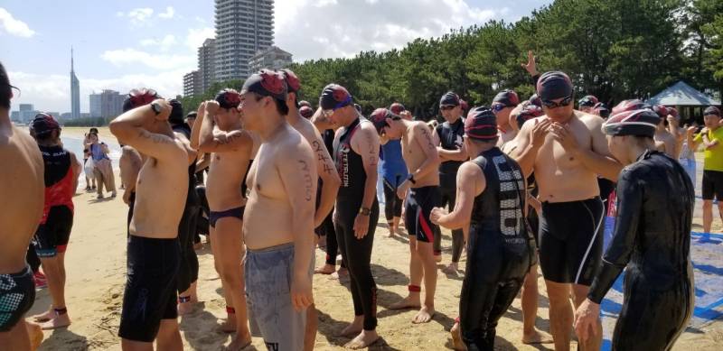 参加者約150名、ショートの部のスタート時外気温32℃、海水温26℃とウエットスーツで泳ぐと熱中症を招きやすくなると忠告した。
