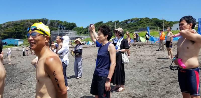 外気温32℃、水温25℃夏の強い日射しが、ウエットスーツ着用の選手には熱さとの戦いのレースとなった。