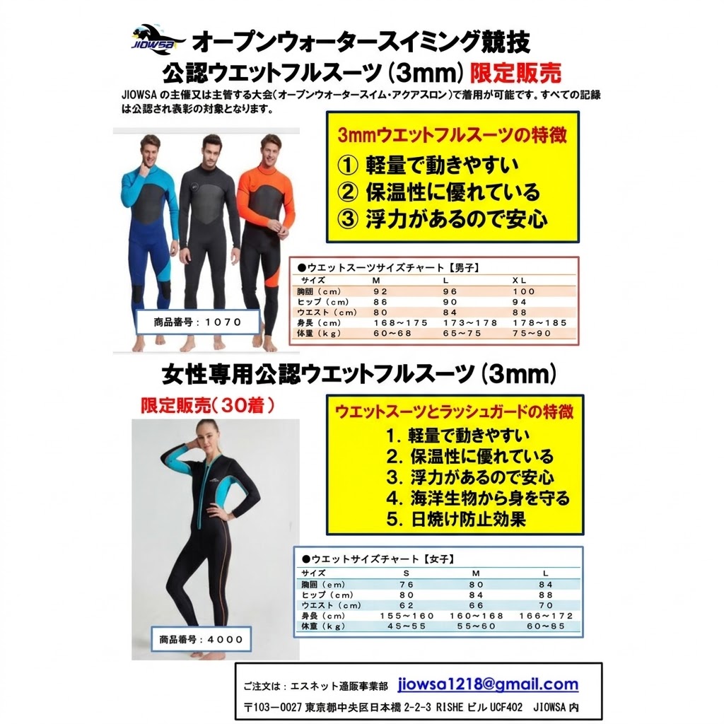 オープンウォータースイミング競技公認ウェットフルスーツ・ラッシュガードの限定販売を開始しました。JIOWSAの主催又は主管する大会(オープンウォータースイム・アクアスロン)で着用が可能です。すべての記録は公認され表彰の対象となります。